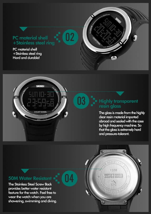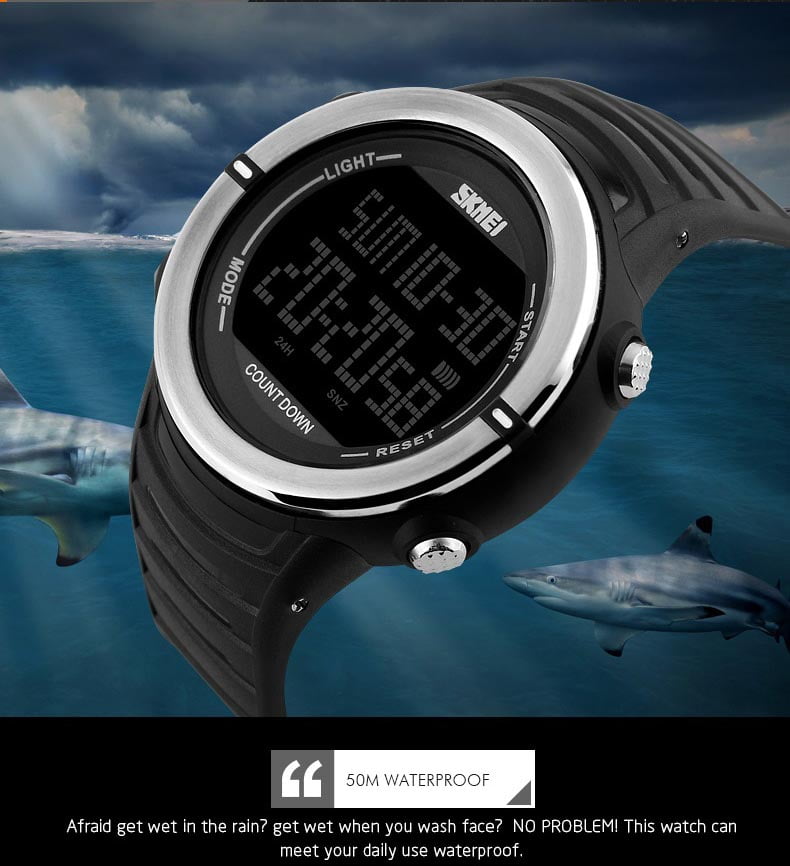 Salah satu kelebihan Jam Tangan SKMEI 1209 yaitu memiliki ketahanan air atau water resistance 50M / 5 ATM / 5 BAR. Sehingga dapat digunakan pada aktivitas seperti cuci tangan, mandi, dan berenang dengan aman.