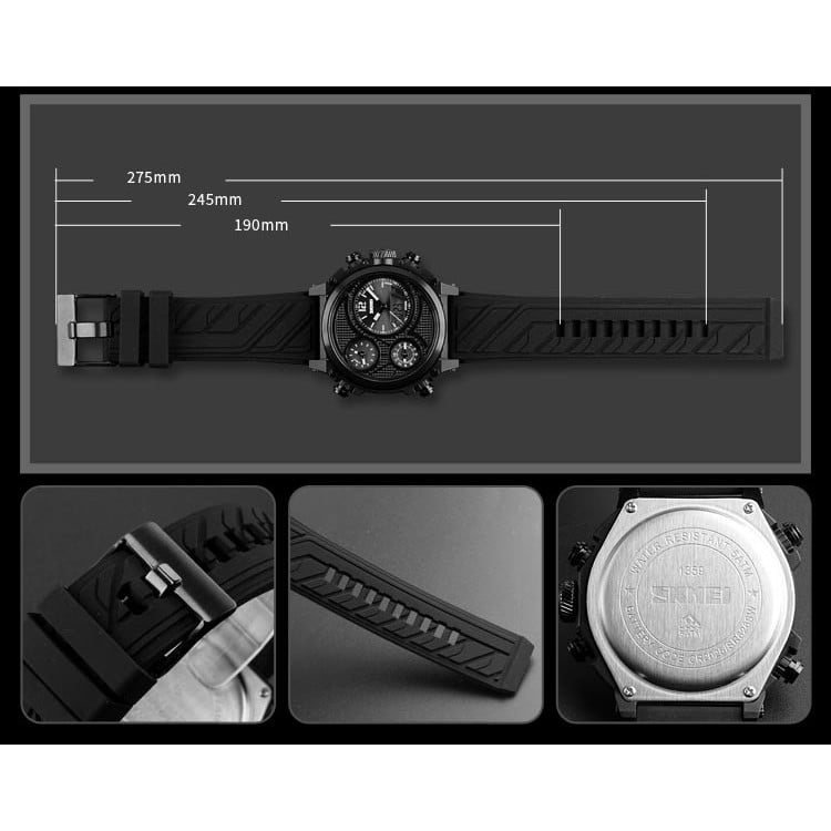 Bagian strap atau tali Jam Tangan SKMEI 1359 terbuat dari bahan PU Rubber (Karet) yang memiliki kualitas awet dan baik dibandingkan Merk kelas serupa lainnya.