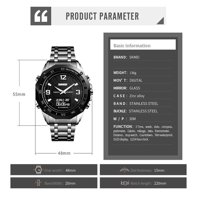 Jam Tangan SKMEI Seri 1464 dilengkapi dengan tampilan dan desain yang modern. Jam Tangan ini sangat cocok digunakan untuk keperluan sehari-hari khususnya bagi kaum pria untuk terlihat lebih unggul, keren dan macho.
