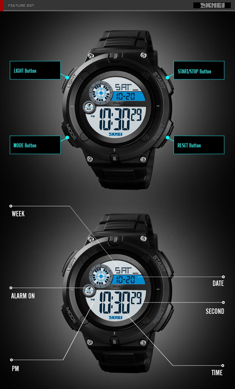 Arloji Tahan Air (Waterproof) SKMEI hadir dilengkapi dengan petunjuk waktu digital yang unik dan bergaya. Selain itu Jam Tangan ini mempunyai beragam fitur lainnya seperti Shock Resistant (Tahan Banting), El Light, Calendar, Stopwatch, Alarm, dll. Jenis Kelengkapan fitur berbeda pada setiap jam dan dapat dilihat langsung pada foto deskripsi produk untuk lebih jelasnya.