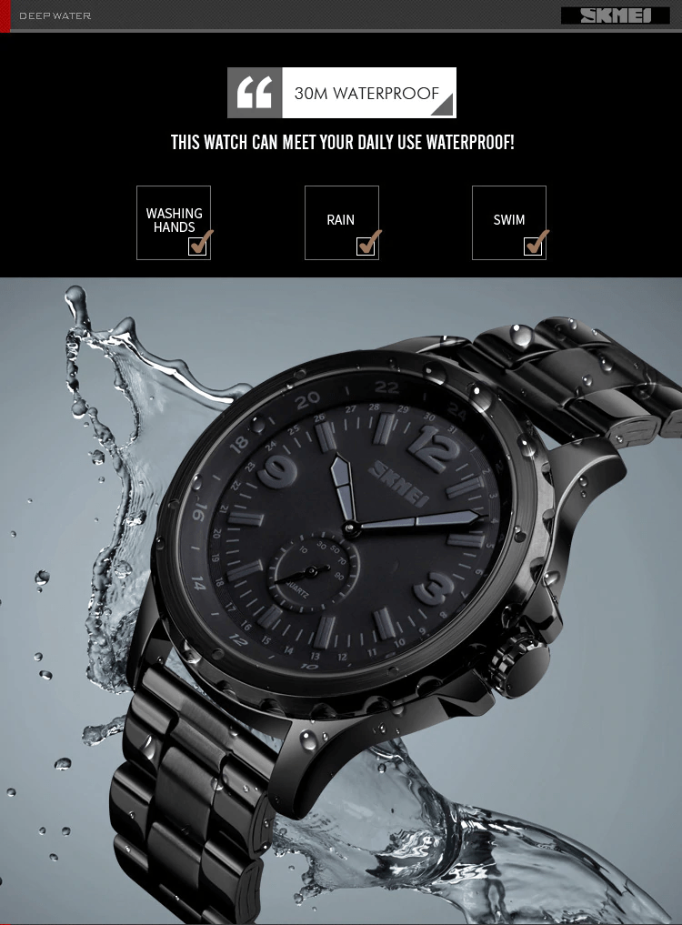 Salah satu kelebihan Jam Tangan SKMEI 1513 yaitu memiliki ketahanan air atau water resistance 30M / 3 ATM / 3 BAR. Sehingga dapat digunakan pada aktivitas seperti cuci tangan,dan Wudhu.