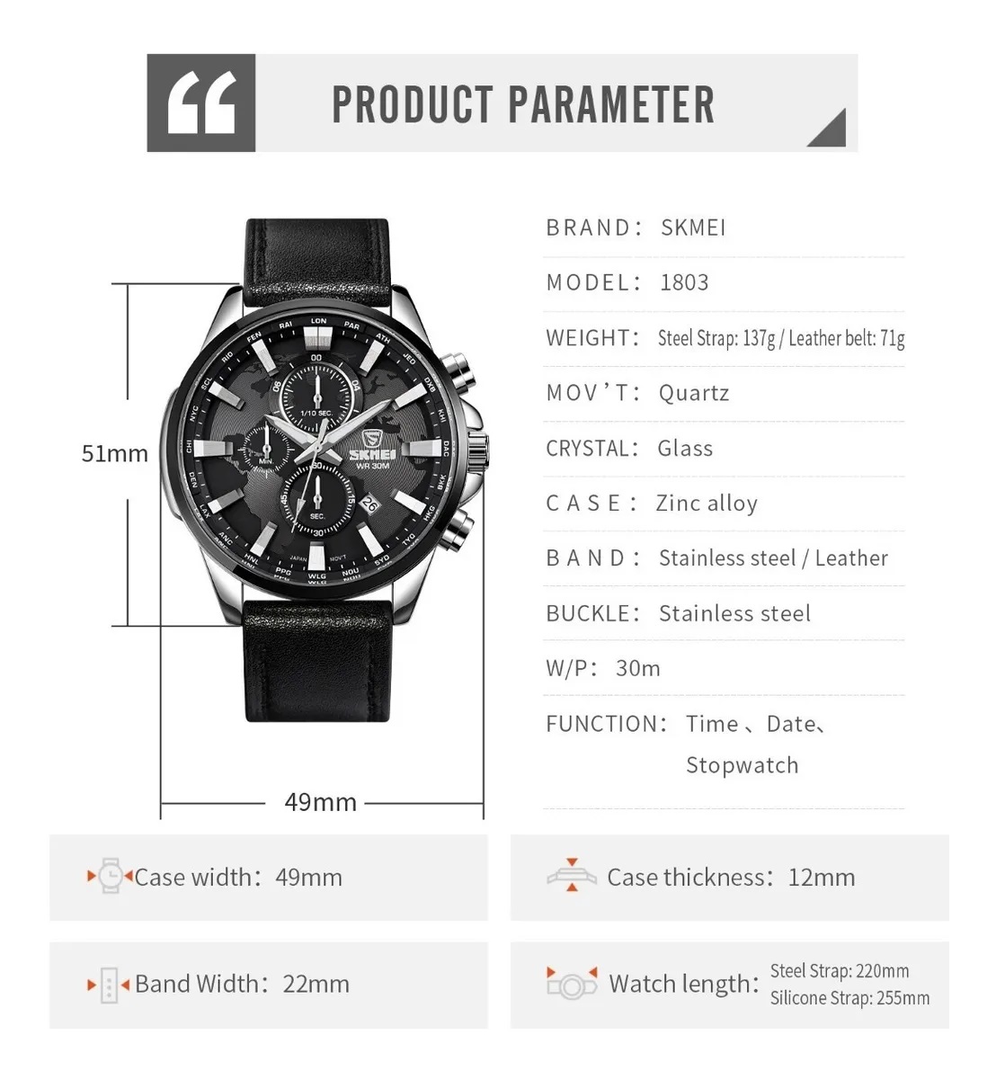 Jam Tangan SKMEI Seri 1803 dilengkapi dengan tampilan dan desain yang modern. Jam Tangan ini sangat cocok digunakan untuk keperluan sehari-hari khususnya bagi kaum Pria untuk terlihat lebih unggul, keren dan Maco.