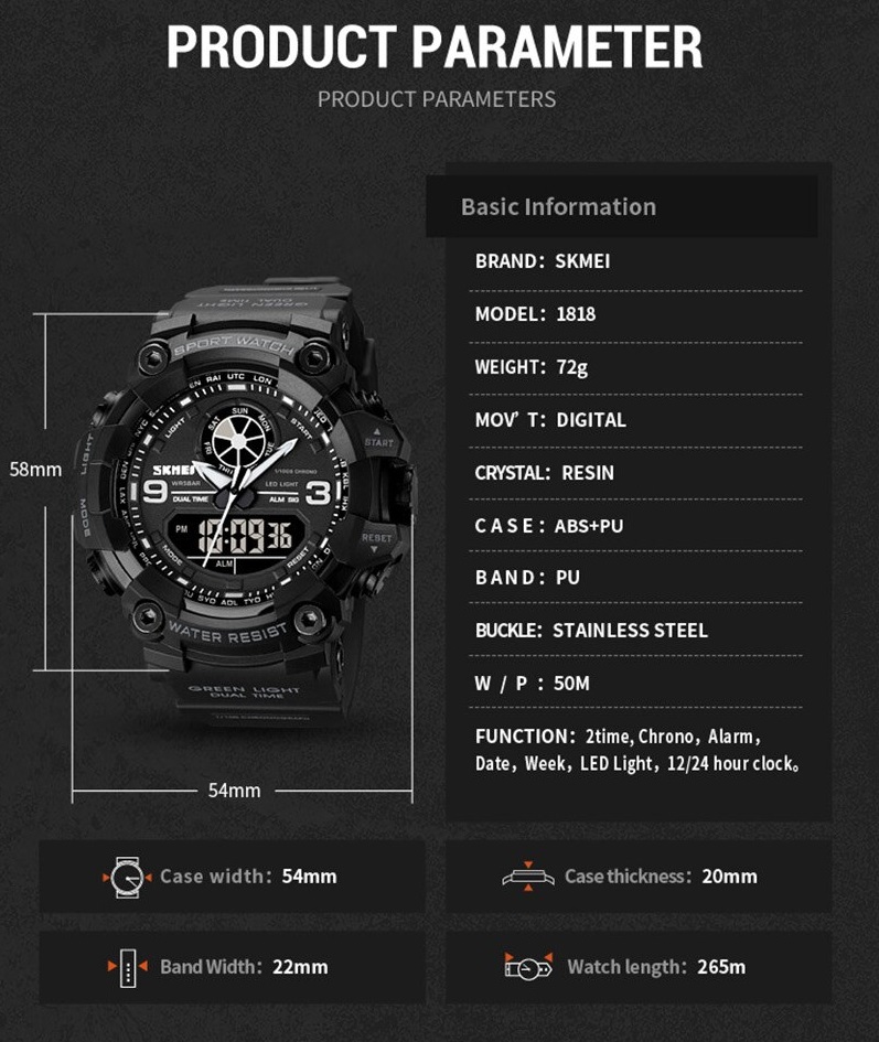 Jam Tangan SKMEI Seri 1818 dilengkapi dengan tampilan dan desain yang modern. Jam Tangan ini sangat cocok digunakan untuk keperluan sehari-hari khususnya bagi kaum pria untuk terlihat lebih unggul, keren dan macho.