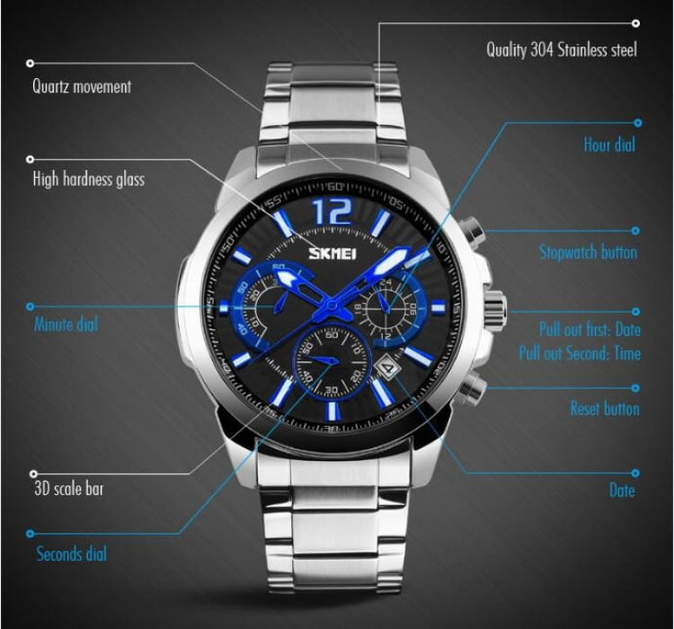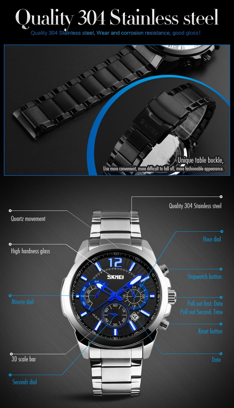 Bagian strap atau tali Jam Tangan SKMEI 9108 terbuat dari bahan Stainless Steel yang memiliki kualitas awet dan baik dibandingkan Merk kelas serupa lainnya.