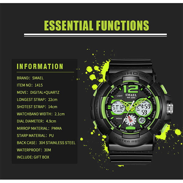 Jam Tangan SMAEL Seri 1415 dilengkapi dengan tampilan dan desain yang modern. Jam Tangan ini sangat cocok digunakan untuk keperluan sehari-hari khususnya bagi kaum Pria untuk terlihat lebih unggul, keren dan Maco.