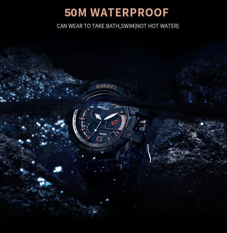 Salah satu kelebihan Jam Tangan SMAEL 1509 yaitu memiliki ketahanan air atau water resistance 50M / 5 ATM / 5 BAR. Sehingga dapat digunakan pada aktivitas seperti cuci tangan,dan Wudhu.