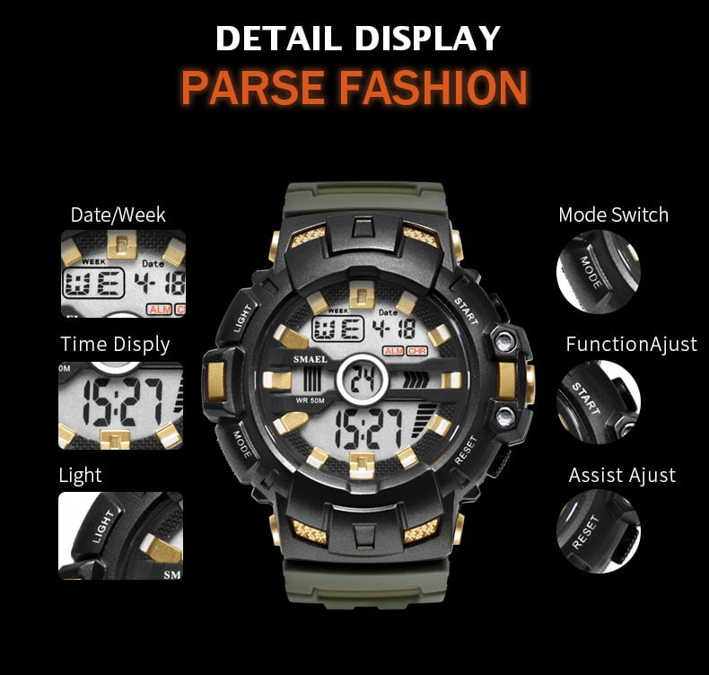 Arloji Tahan Air (Waterproof) SMAEL hadir dilengkapi dengan petunjuk waktu yang unik dan bergaya. Selain itu Jam Tangan ini mempunyai beragam fitur lainnya seperti Shock Resistant (Tahan Banting), El Light, Calendar, Stopwatch, Alarm, dll. Jenis Kelengkapan fitur berbeda pada setiap jam dan dapat dilihat langsung pada foto deskripsi produk untuk lebih jelasnya.