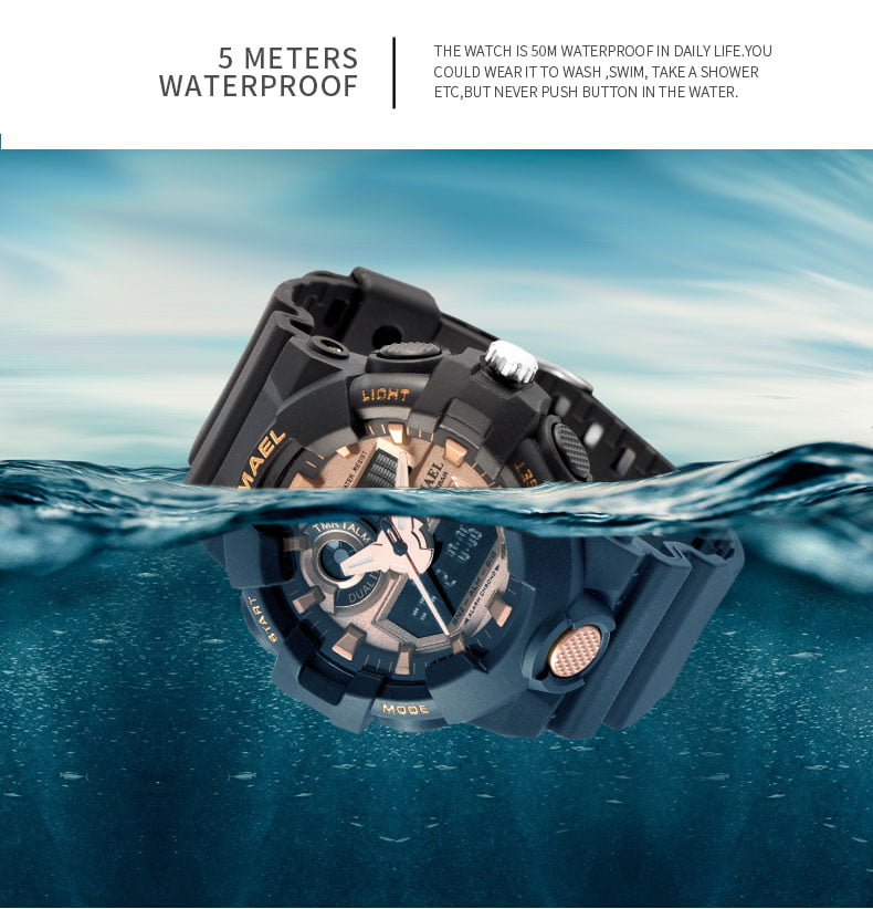 Salah satu kelebihan Jam Tangan SMAEL 1642 yaitu memiliki ketahanan air atau water resistance 50M / 5 ATM / 5 BAR. Sehingga dapat digunakan pada aktivitas seperti cuci tangan,dan Wudhu.